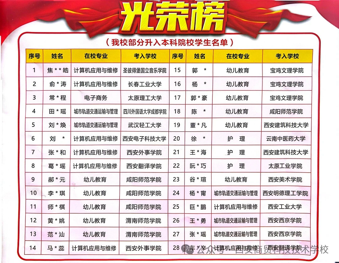 学院率先实行职业技能加职教升学双向型人才培养计划,学生学业期满后,可参加陕西省综合评价和职教单招考试,升入专科院校,同时,通过职教高考升入咸阳师范学院、渭南师范学院、榆林学院等多所本科院校,使学生的学历层次、专业技能等级得到双向提升,打通了技能型人才的上升通道。